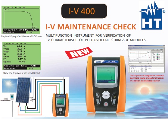 I-V 400 is the ideal solution for the ordinary and scheduled maintenance of photovoltaic systems. With I-V 400, searching for possible failures and problems in systems is extremely rapid, efficient and intuitive. I-V 400 carries out the field measurement of the I-V characteristic and of the main characteristic parameters both of a single module and of module strings. The instrument measures, together with the I-V characteristic of the device being tested, also the values of its temperature and incident irradiation.