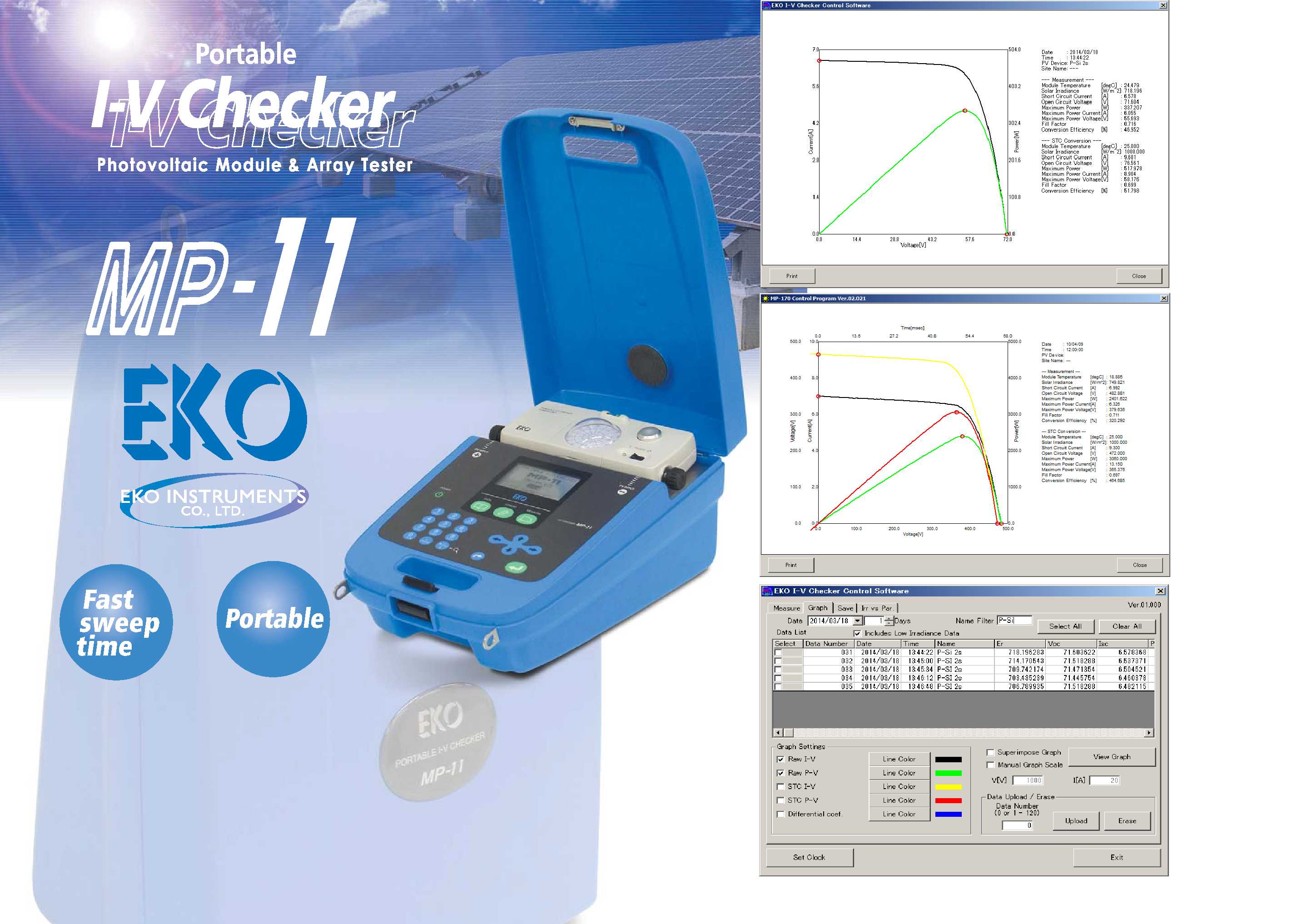 The portable battery operated MP-11 Checkers enable the operator to perform accurate PV performance measurements, known as I-V characteristics of PV modules or arrays on site. For direct control of the measurement functions and viewing the measurement results the Main Unit has a key pad and Graphical LCD display. These IV Checkers offer all in one measurement solution to make PV module testing very easy, hence all required accessories like the radiation sensor, temperature sensors, cables and PC software for control and extended data analysis are included. |